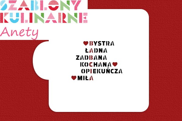 Nowość w naszej ofercie - szablon dwuczęściowy. Wzorem krzyżówki z hasłem "Babcia" możesz udekorować słodkości z okazji Dnia Babci :). Przy użyciu jednego szablonu wykonasz hasło i serduszka, drugi szablon umożliwi Ci zrobienie wyrazów krzyżówki składające się na hasło.