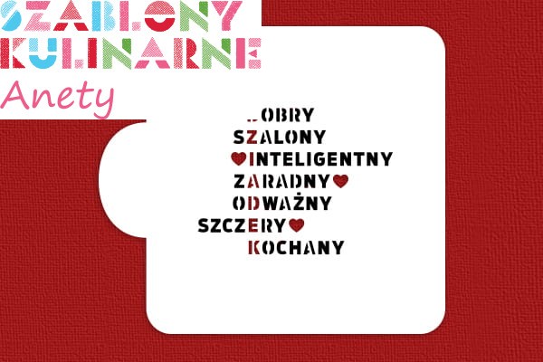 Nowość w naszej ofercie - szablon dwuczęściowy. Wzorem krzyżówki z hasłem "Dziadek" możesz udekorować słodkości z okazji Dnia Dziadka :). Przy użyciu jednego szablonu wykonasz hasło i serduszka, drugi szablon umożliwi Ci zrobienie wyrazów krzyżówki składające się na hasło.
