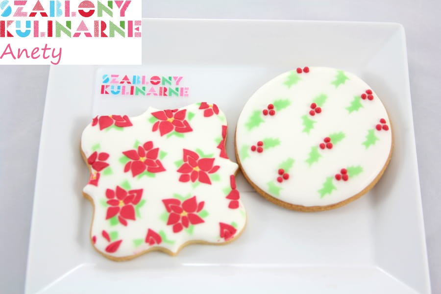 - Ułożyć szablon na rozwałkowanej masie cukrowej lub ostudzonym ciastku pokrytym lukrem królewskim