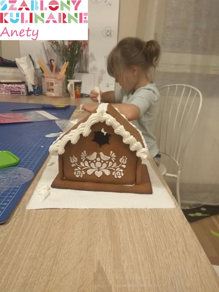 - Po nałożeniu lukru, delikatnie podnieść szablon trzymając za uchwyt i pozostawić dekorację do wyschnięcia