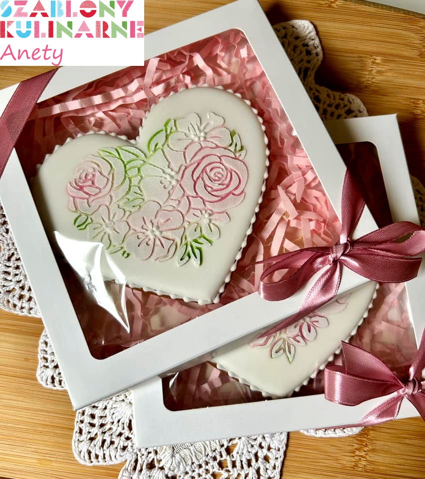 Przy użyciu szablonu możesz wykonać dekorację z lukru królewskiego, cukru pudru, kakao, czy też barwników spożywczych.