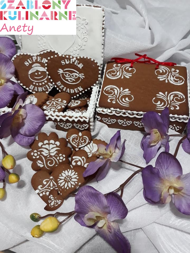 Przy użyciu szablonu możesz wykonać dekorację z lukru królewskiego, cukru pudru, kakao, czy też barwników spożywczych, np. w spray'u.