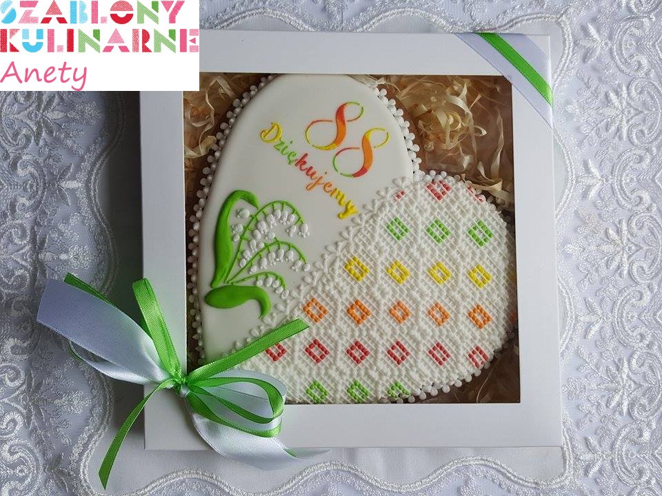 - Po nałożeniu lukru, delikatnie podnieść szablon trzymając za uchwyt i pozostawić dekorację do wyschnięcia