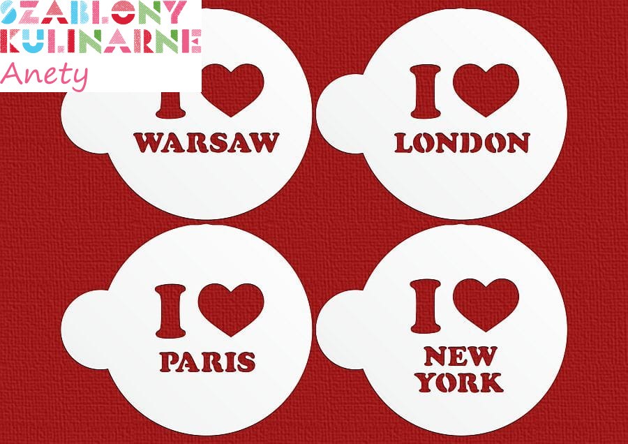Wzory w zestawie: I love Warsaw, I love London, I love Paris, I love New York