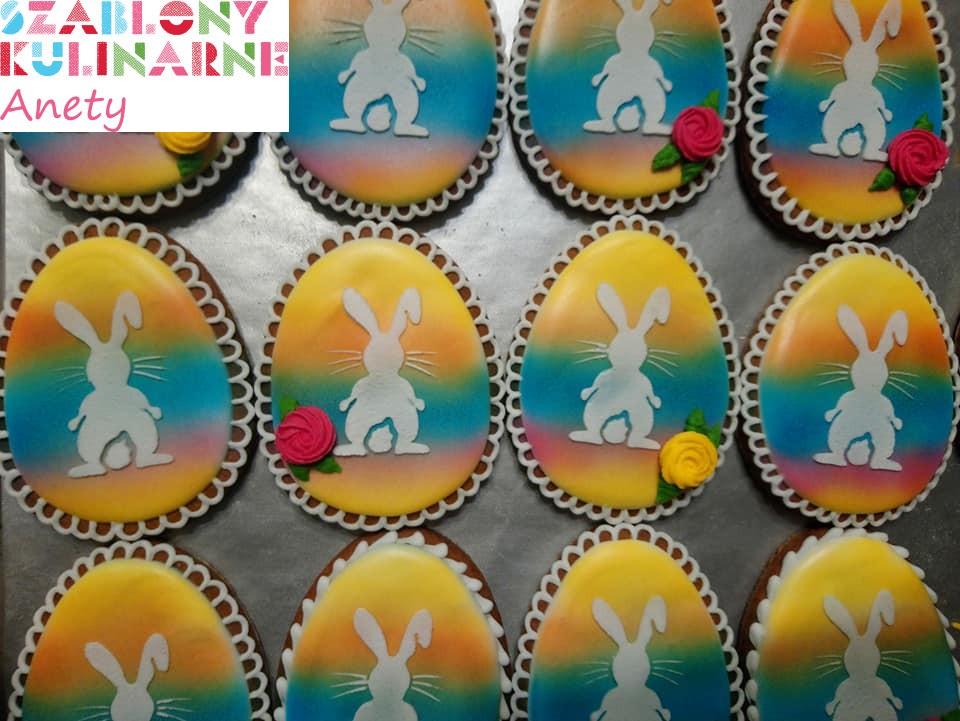 Czym byłaby Wielkanoc bez wielkanocnych króliczków? :-) Namalujcie razem z pociechą uśmiechniętego królika z muchą na Waszych ulubionych kruchych ciasteczkach. Możecie to zrobić przy użyciu szablonu oraz lukru królewskiego, cukru pudru, kakao, czy też barwników spożywczych (np. w spray'u).