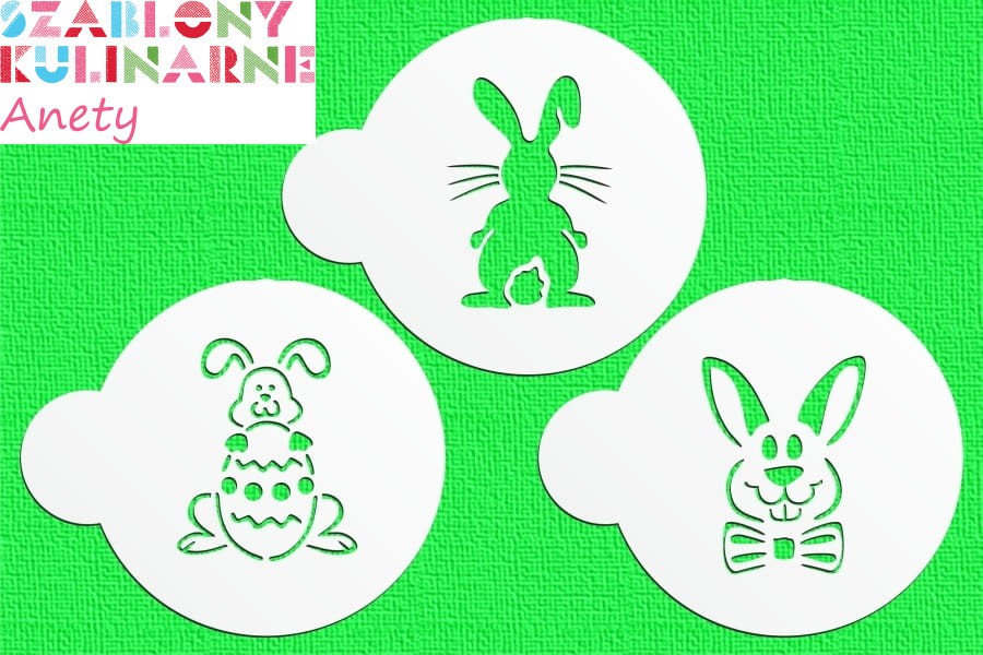 Wzory w zestawie: królik z ogonkiem, królik z pisanką, głowa królika z muchą