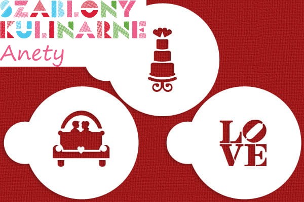 Wzory w zestawie: tort piętrowy, auto z nowożeńcami, napis LOVE