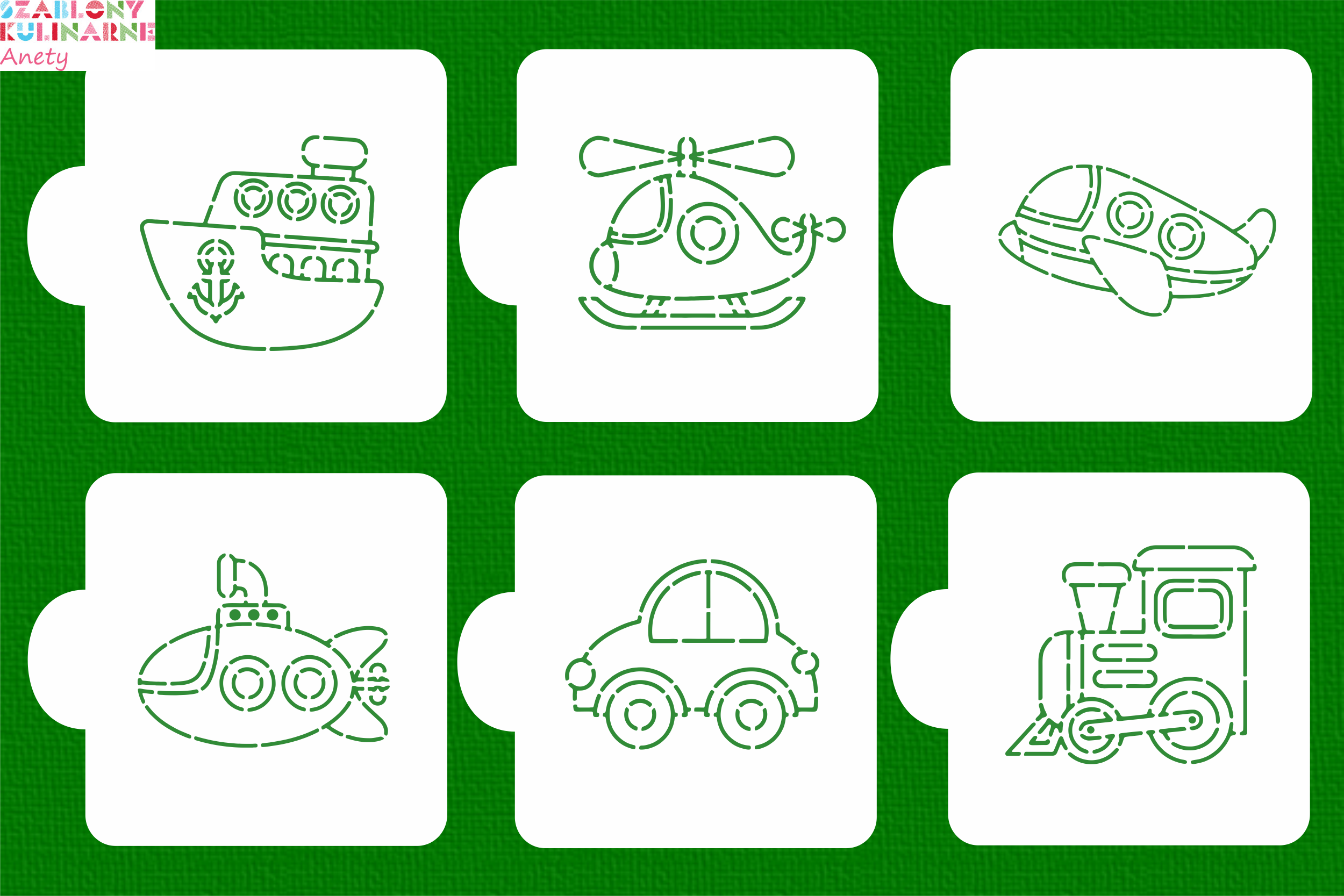 Wzory: łódź podwodna, auto/garbus, helikopter, statek, samolot, lokomotywa